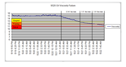 關注這件事,他插裝一個火車頭,被指定為高風險與機載粘度計安裝在其潤滑油循環線。火車頭然后又恢復正常服務。很長一段時間,粘度跟蹤設計的粘15 - 15.5 cP,驗證了在一間實驗室停止。然后,車載儀器顯示粘度下降。