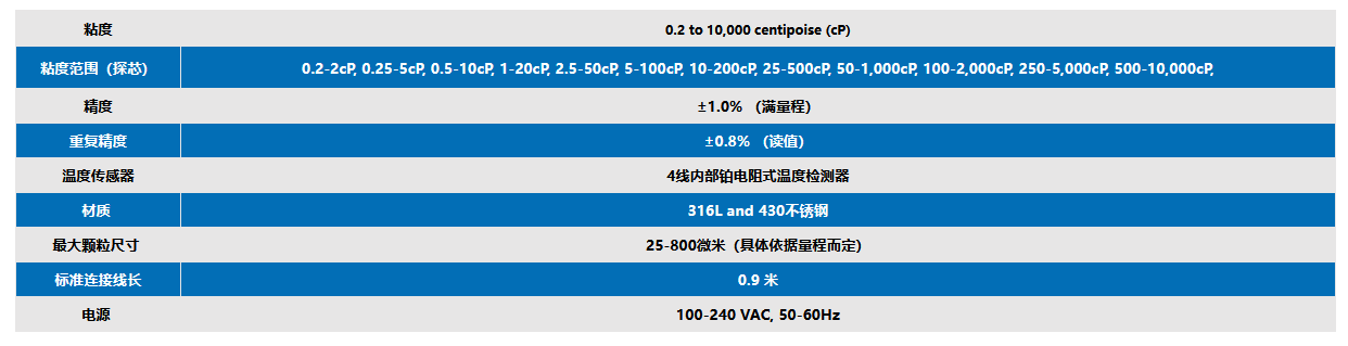可選粘度范圍(探芯) 0.2-2cP, 0.25-5cP, 0.5-10cP, 1-20cP, 2.5-50cP, 5-100cP, 10-200cP, 25-500cP, 50-1,000cP, 100-2,000cP, 250-5,000cP, 500-10,000cP,?